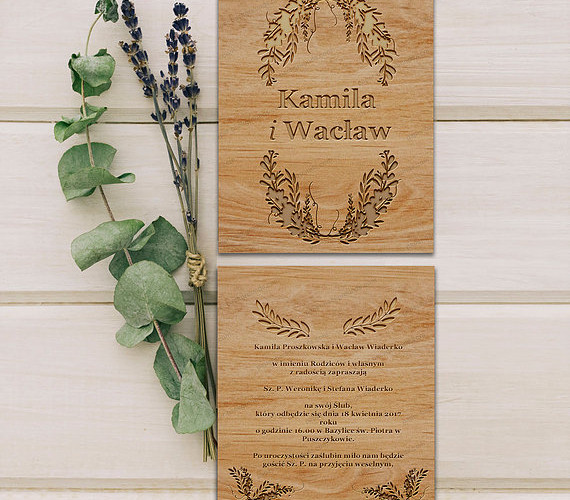 Zaproszenia oraz inne elementy poligraficzne można dobrać na podstawie motywu roślinnego: zboża, kwiatów albo wybrać świetnie pasujące do miejsca zabawy weselnej zaproszenia drewniane.